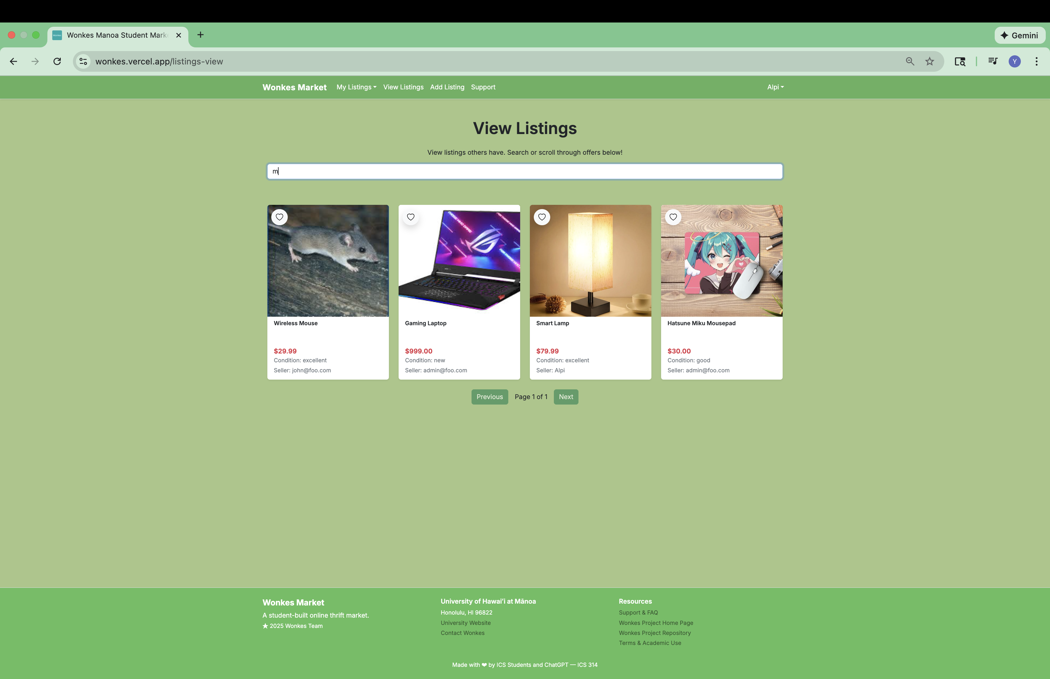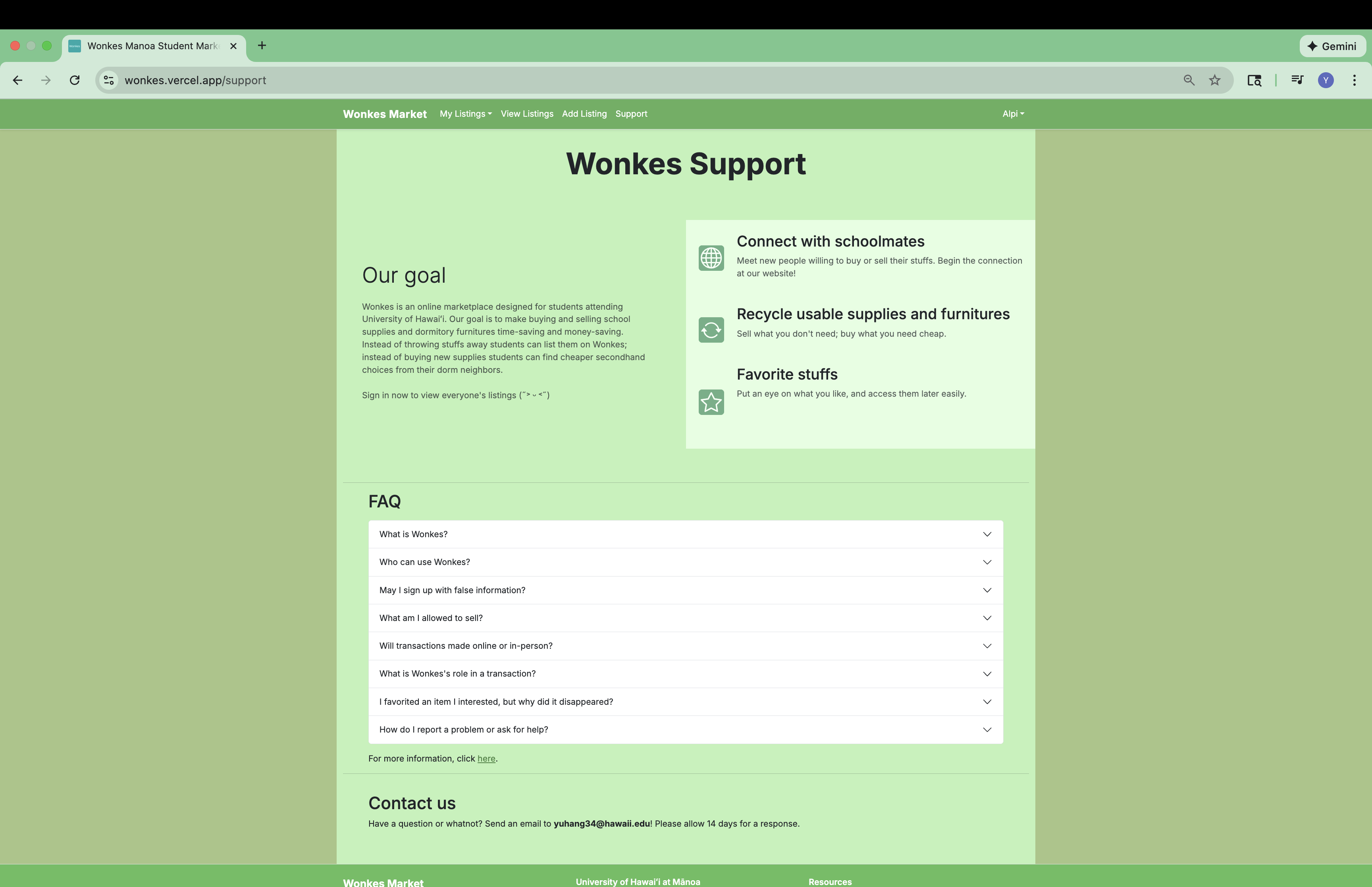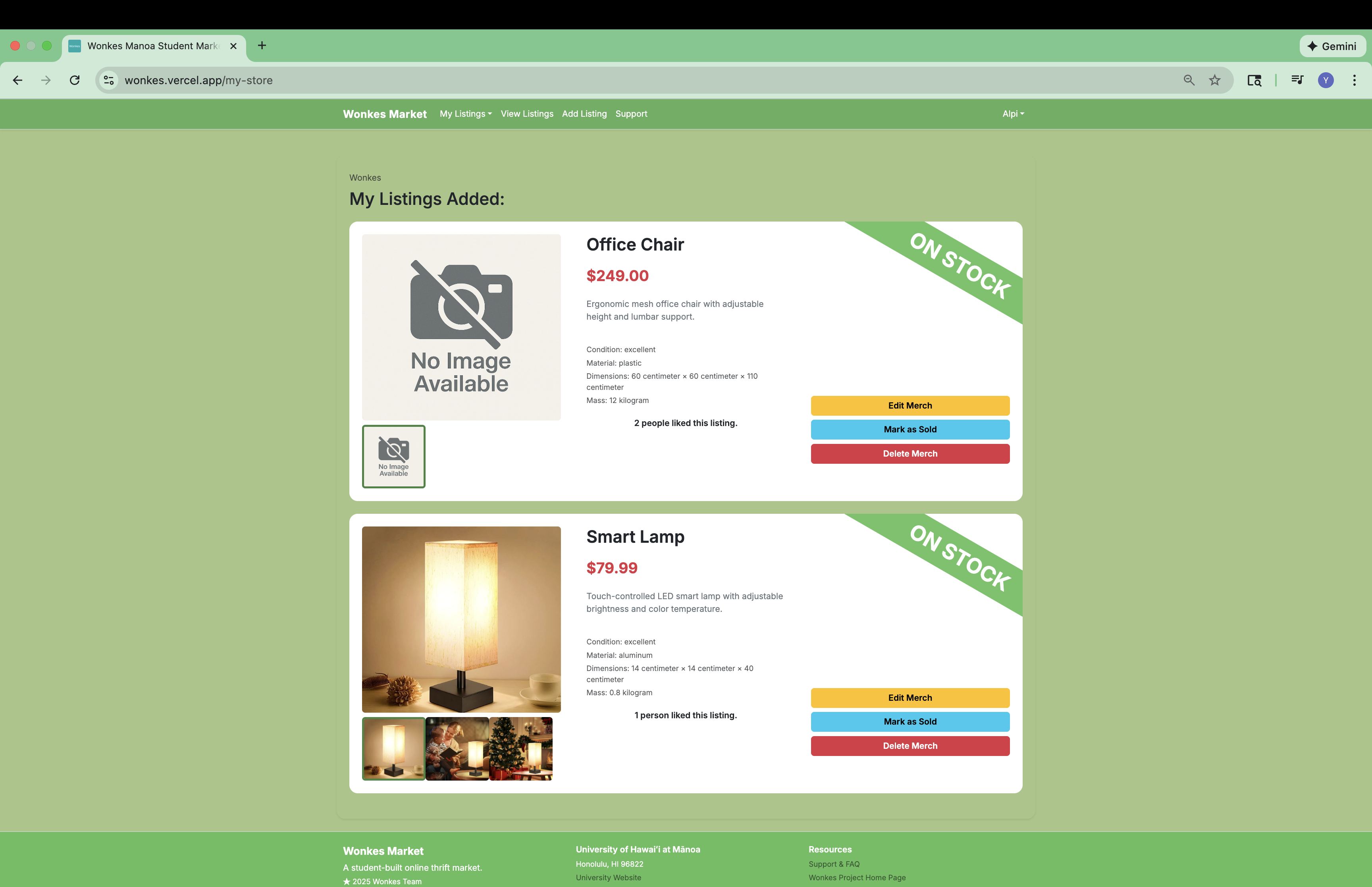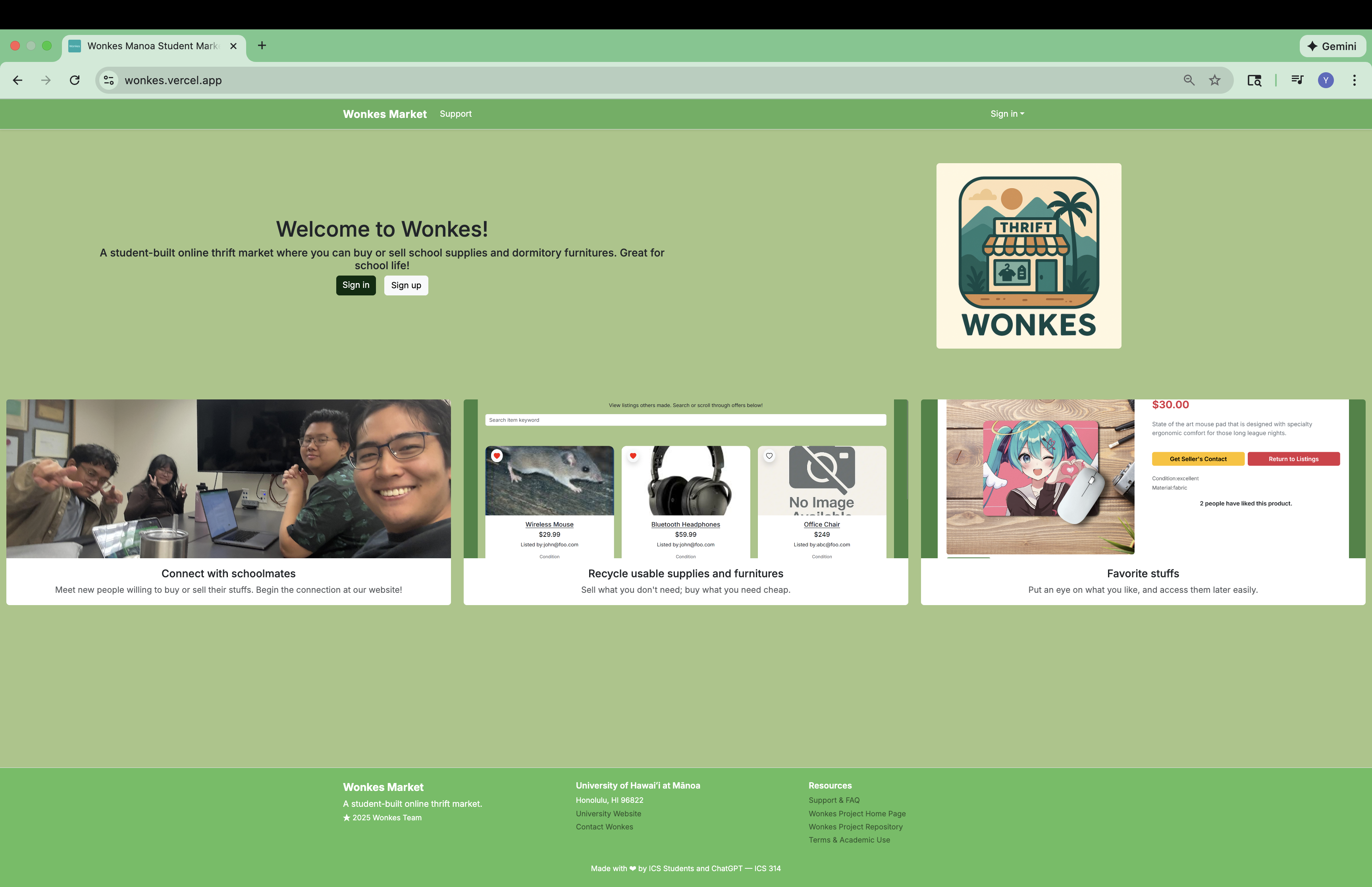 Wonkes Market is an online marketplace designed for UH Mānoa students. Our goal is to make buying and selling campus-related items quicker and money-saving. Instead of throwing things away students can simply list them on Wonkes. Instead of spending money on new supplies next semester, students can find cheaper secondhand items from their dorm neighbors.