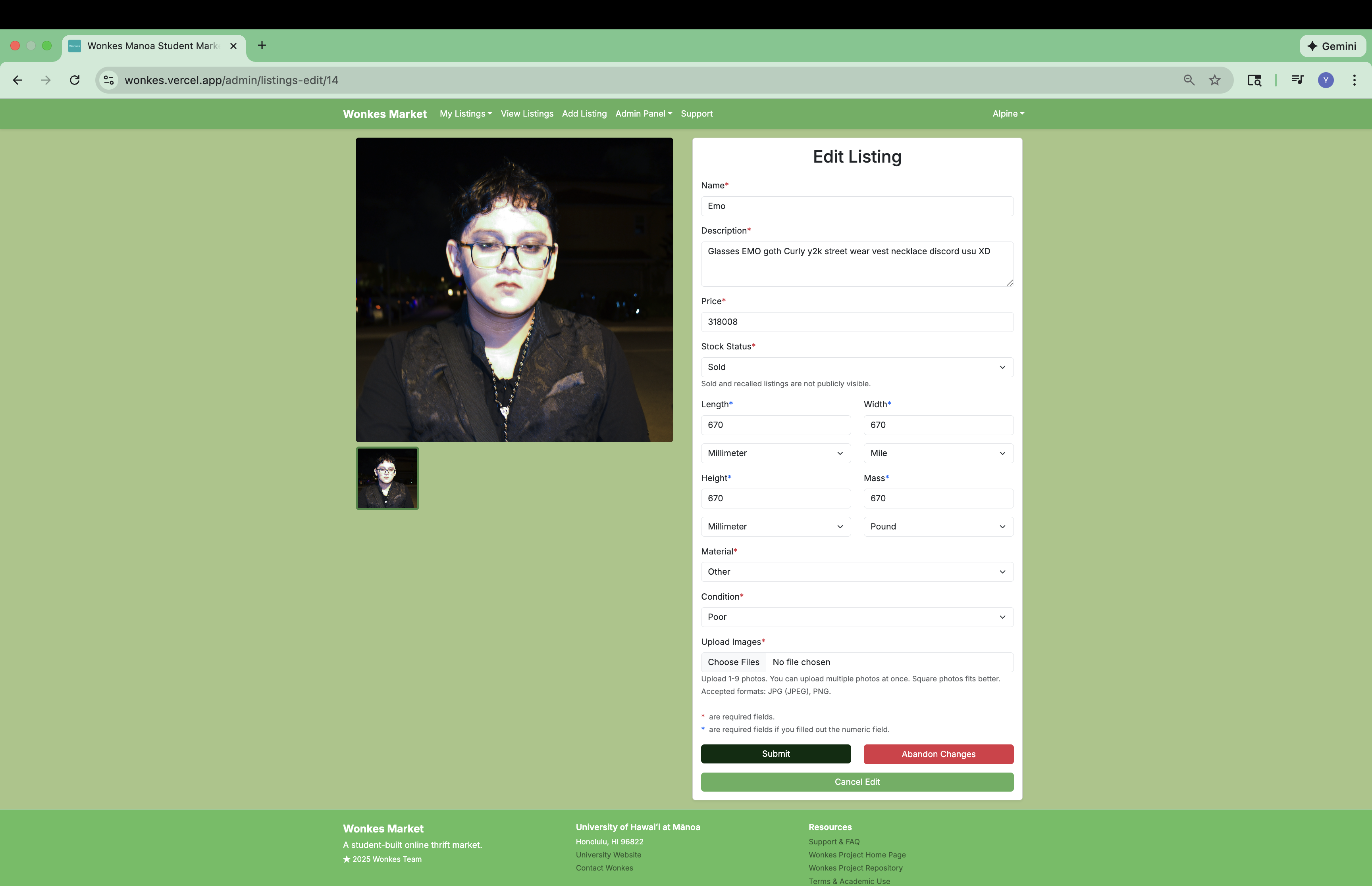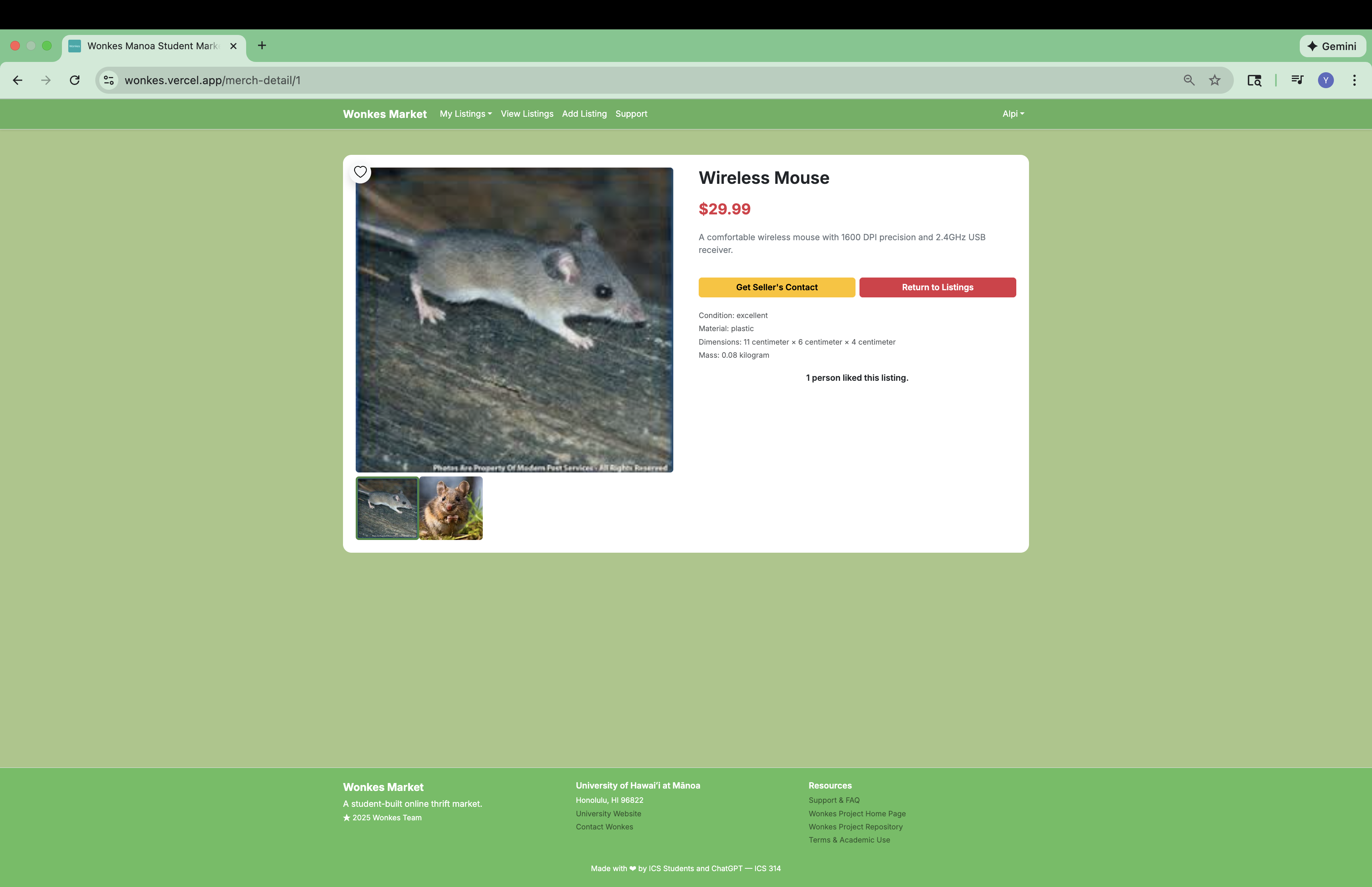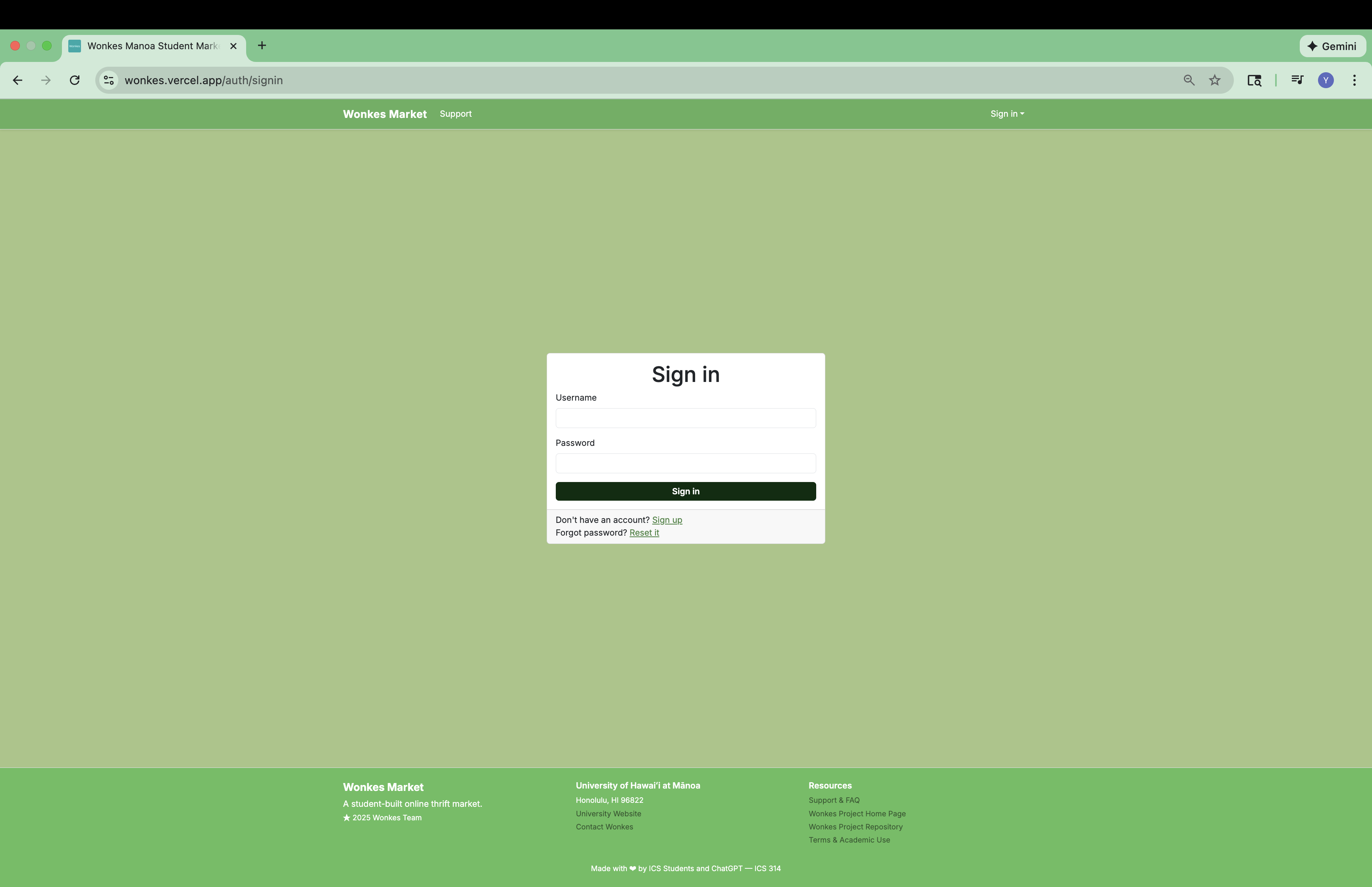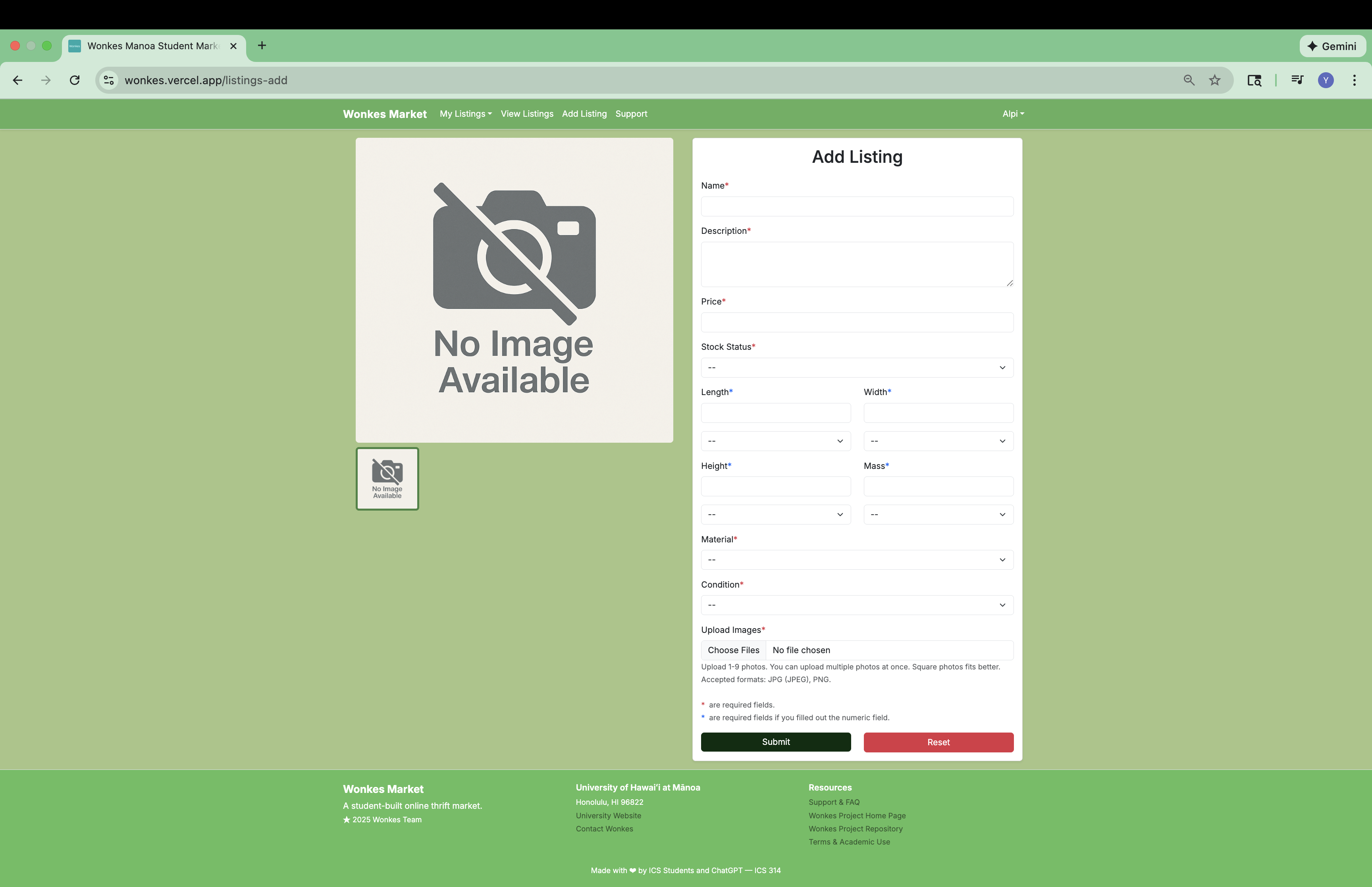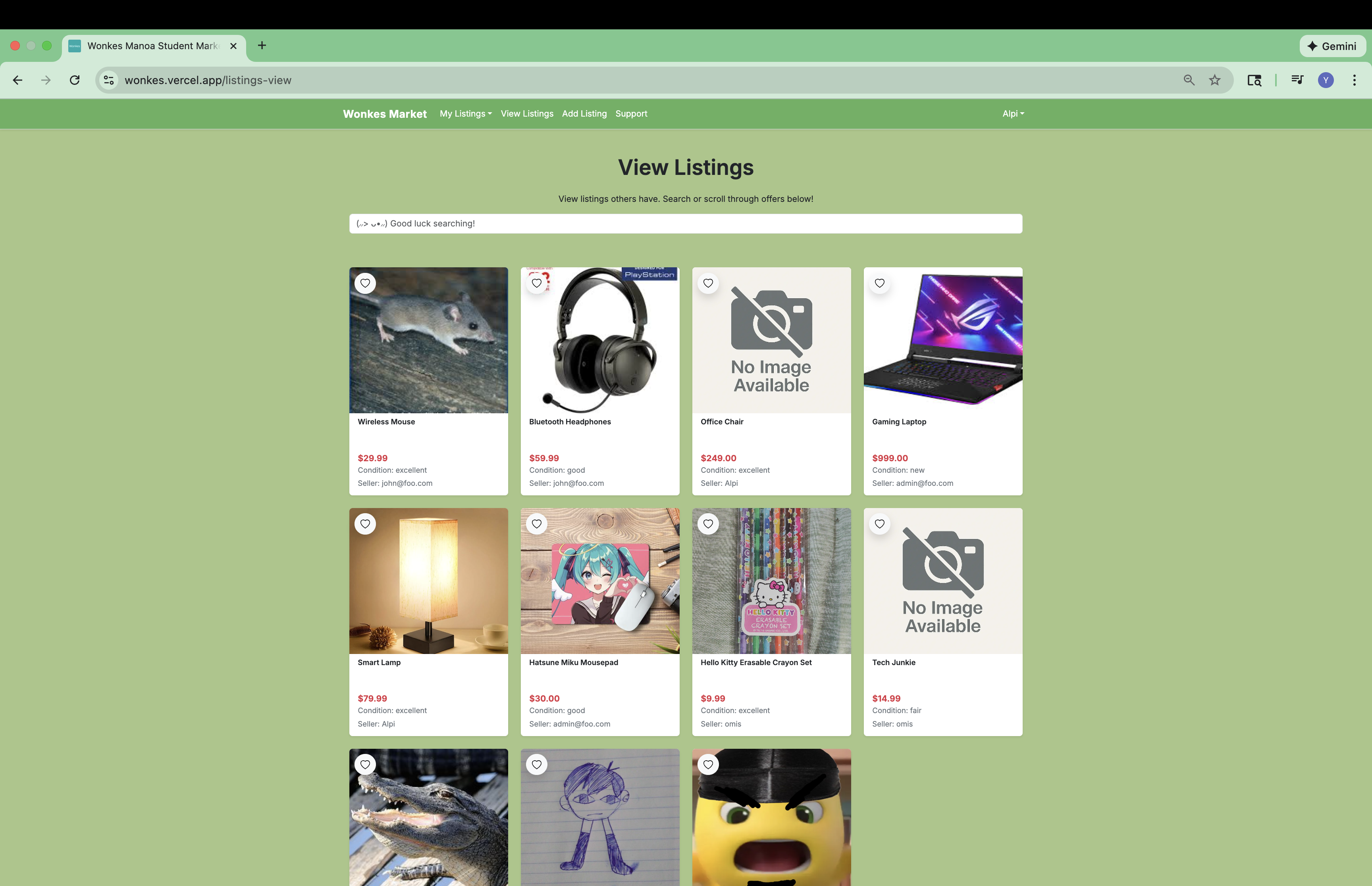 Wonkes Market is an online marketplace designed for UH Mānoa students. Our goal is to make buying and selling campus-related items quicker and money-saving. Instead of throwing things away students can simply list them on Wonkes. Instead of spending money on new supplies next semester, students can find cheaper secondhand items from their dorm neighbors.