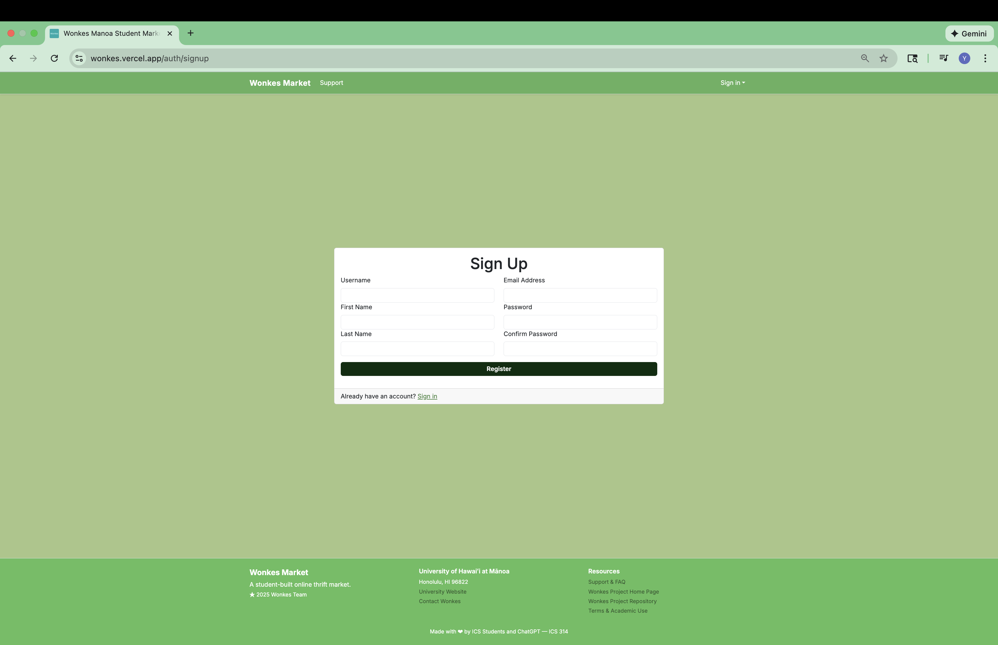 To sign up, you will provide an username, an UH email address (@hawaii.edu email address), a password, and your legal first and last name. Your username and email address can not repeat with other Wonkes Market users.